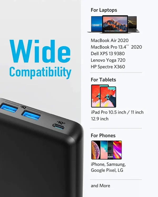 Charge 3 Device at Once: PowerCore is equipped with a USB-C port plus two 12W USB ports to support simultaneous charging for up to 3 devices. Note: the total max output when all ports are connected is 60W.